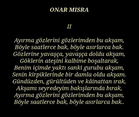 Ayırma gözlerini gözlerimden bu akşam böyle saatlerce bak böyle asırlarca bak. Gözlerin ateşini kalbime boşaltarak benim için yaktı sanki gurubu akşam. Gündüzden gürültüden ve kainattan ırak akşamı seyredeyim bakışlarında bırak ayırma gözlerini gözlerimden bırak. Ufuktaki lambanın fitilini kısarak benim içimde yaktı sanki grubu akşam tutuşan bağrım için ne serin bir su akşam.