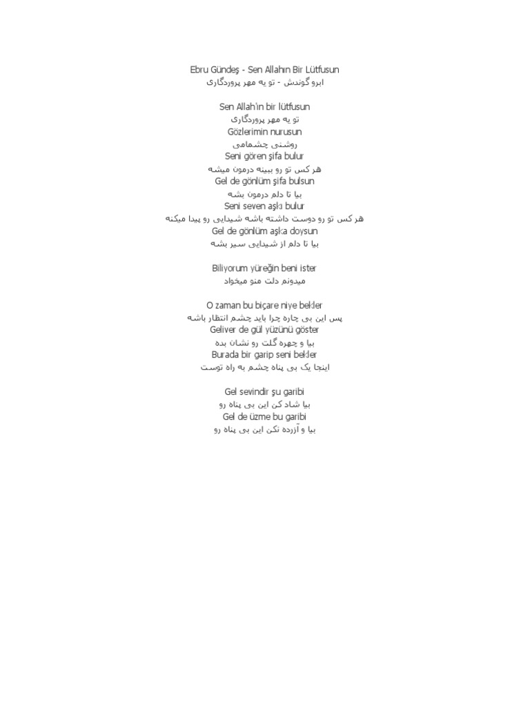 Sen allahin bir lutfusun sen gözlerimin nurusun seni gören sifa bulu. Sen allahin bir lutfusun gözlerimin nurusun seni gören sifa bulur gelde gönlüm sifa bulsun seni seven aski bulur gelde gönlüm aska doysun. Ebru gündeş sen allahın bir lütfusun şarkısını şarkı sözü ile birlikte dinle. Sen allah ın bir lütfusun.