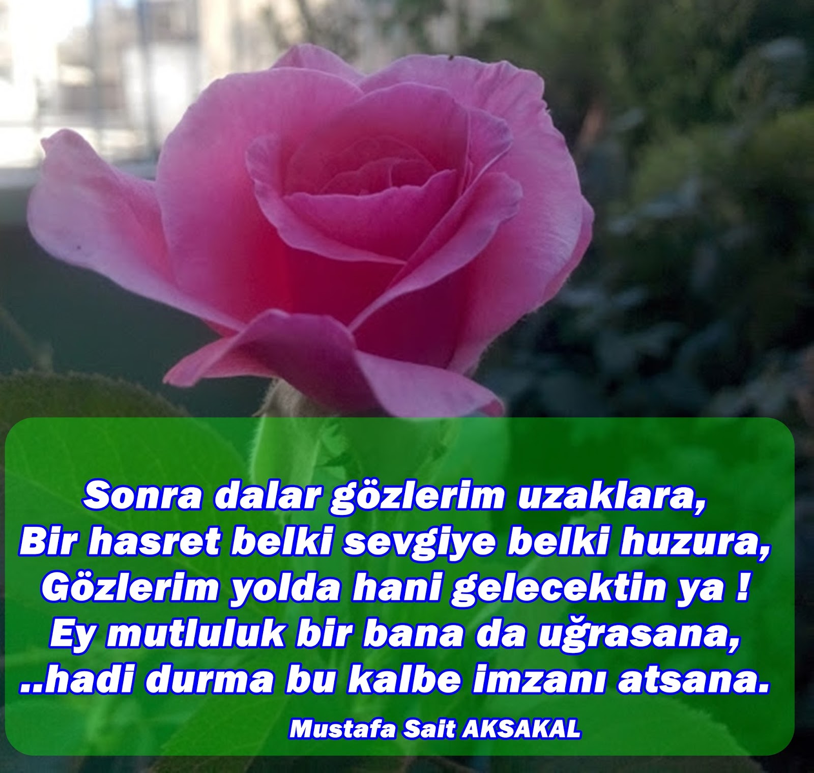 Gözlerim öyle uzaklara dalarken bazende seyre dalar belki bir sevgili belkide ağlayan annemdir bilinmez umut ederken sevgiliye umutsuzda degildi bir gün çıka gelsin. Bekliyor gözlerim ümitle uzaklari. Gözlerim dalar uzaklara drop düşmüş tarlalara herkes uçar arabalarla hani benim awm em. ümit varsa sonrasinda beklemekte güzeldir.