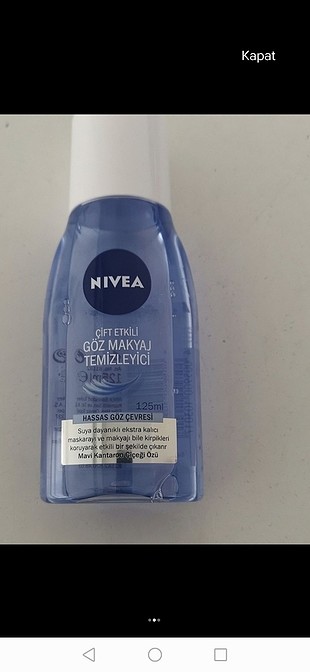 Nivea göz makyaj temizleyici. Nivea bakım yapan göz makyaj temizleyici suya dayanıklı kalıcı maskarayı ve makyajı bile çıkarır. Hassas göz çevresini nazikçe temizler ve yatıştırır. Kullanmadan önce iyice çalkalayın. C vitamini içerir.